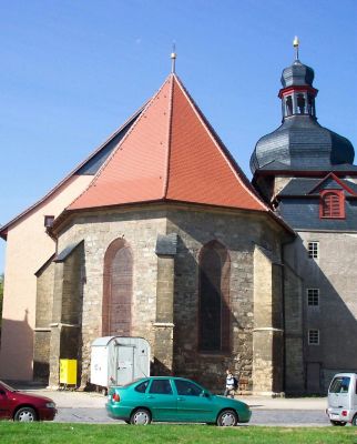 Dennoch entwickelte sich die Stadt zu ihrem Vorteil weiter, in der Graf Wilhelm von Schwarzburg 1571 den Wohnsitz einnahm. Von 1596 bis 1598 ließ Graf Wilhelm die Klosterkirche abreißen und ein neues Gotteshaus errichten, dessen Ostansicht der heutigen Kirche ähnlich war. Der Turm wurde erst 56 Jahre später, z.T. aus Steinen der Arnsburg, fertiggestellt. /20/ Der Graf verstarb 1597 und konnte somit die Weihe nicht miterleben.